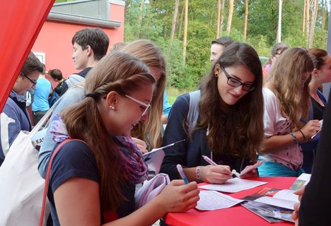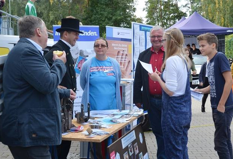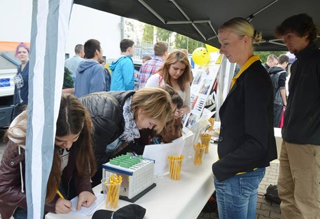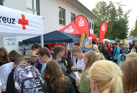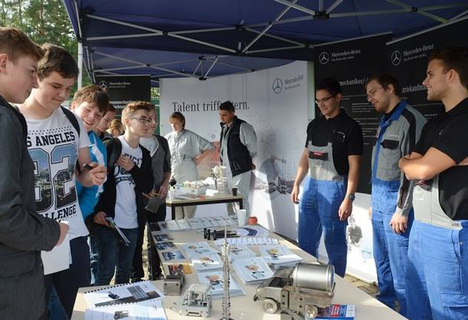 "Wir wollen erreichen, dass junge Menschen in der Region bleiben und somit den Fachkräftenachwuchs sichern". Dafür, dass es ausreichend attraktive Möglichkeiten gibt, spricht die hohe Anzahl der beteiligten Unternehmen. Neben sportlichen Wettkämpfen wie Staffellauf, Torwandschießen, Speed- und Fußball wird an Infoständen von knapp 30 Firmen einiges rund um die berufliche Zukunft für die Schüler geboten. An den Messeständen rund um die Stadion-Tribühne gab es Berufsberatung von Azubis für Azubis. An den Ständen der örtlichen Unternehmen wie Mercedes, Gestamp, Fiebe, MTU, Druckerei Thiel, Krankenhaus und anderen erfuhren die Jugendlichen alles rund um die Ausbildung.