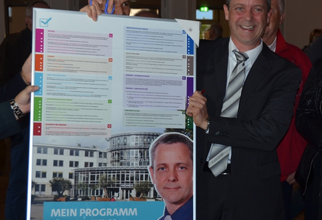 Pressesprecherin Marina Ujlaki betrat die Bühne, beglückwünschte Andreas Igel und holte den baldigen Bürgermeister auf die Bühne. "Wie Sie alle wissen, hätte vor einem halben Jahr niemand von uns damit gerechnet, dass ich als Bürgermeisterkandidat für Ludwigsfelde antreten werde", erinnerte Igel. Der plötzliche Tod des amtierenden Bürgermeisters Frank Gerhard sei ein Schock für alle gewesen, mit dem es nun umzugehen gilt. Er wolle jedoch nicht versuchen, die Arbeit Gerhards eins zu eins zu kopieren, sondern wolle seinen eigenen Weg finden.