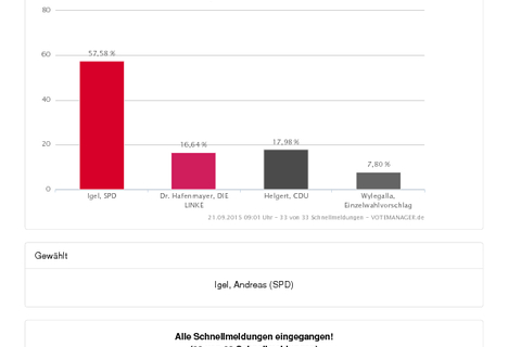 Unter Beifall betrat Andreas Igel (SPD) zusammen mit seiner Frau und seinen drei Kindern knapp eine Stunde nach Schließung der Wahllokale den Klubhaus-Saal. Zu diesem Zeitpunkt waren bereits 31 Wahlbezirke ausgezählt, das Quorum bereits erfüllt. Es folgten Glückwünsche, Umarmungen und Pressefotos. Als kurze Zeit später auch die Ergebnisse der Briefwahlen auf der Leinwand erschienen, gab es erneut Jubel: Mit 57,58 Prozent der Stimmen hat Igel die Mehrheit, die Stichwahl bleibt ihm erspart.