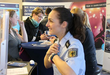 Direkte Bewerbungen konnte neben 39 anderen Ausstellern auch die Europäische Sportakademie einstreichen: "Ähnlich wie bei Schirmherr Axel Schulz gibt es viele, die ihr sportliches Talent zum Beruf machen wollen", so Mitarbeiter Patrick Ziebell. "Bei uns kann man das obendrein mit einem Studium verknüpfen." Ziebell blieb am Ende des Tages fast die Stimme weg - ein gutes Zeichen, wie er fand. Er zog eine Tagesbilanz von etwa 100 Gesprächen. Damit verbuchte er aber immer noch nicht den Rekord. Spitzenreiter waren neben Bundeswehr, Zoll und Polizei das Berufsbildungszentrum Kleinmachnow mit 140 sowie die Drogeriekette dm mit 120 Gesprächen - der Schnitt lag hingegen bei 80 Gesprächen in fünf Stunden Messezeit.
