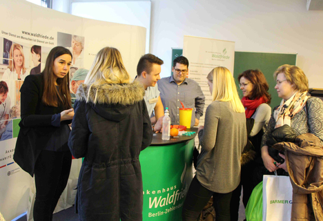 Aus Ludwigsfelde kam Sophie gemeinsam mit ihrer Schwester. Sie sah sich eher im Gesundheitswesen um. Vielleicht Altenpflegerin oder doch lieber Kauffrau im sozialen Bereich? Mehrere Aussteller erklärten der wortgewandten 16-Jährigen, worauf es ankommt. "Selbstbewusstsein und Aufgeschlossenheit sollte man mitbringen - denn Pflege bedeutet den direkten Umgang mit Patienten", sagte Benjamin von Albert vom Krankenhaus Waldfriede. Die Schülerin schien überzeugt und übergab ihm kurzerhand ihre Bewerbung. Nun heißt es: Daumen drücken für Sophie!